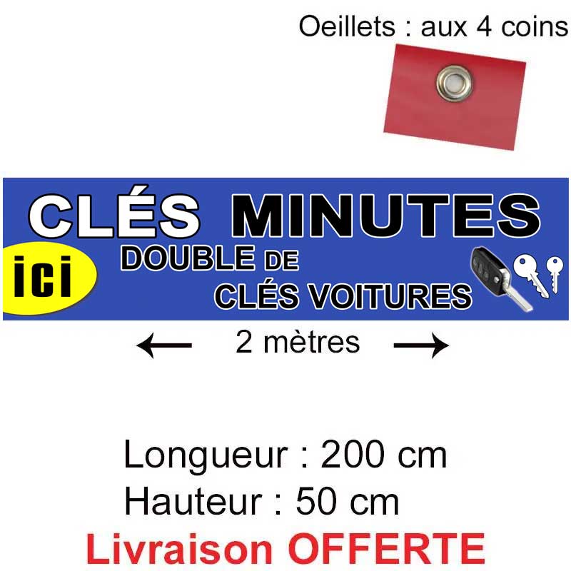 BANDEROLE IMPRIMÉE « CLÉS MINUTES & clés voitures » fond bleu 2 mètres x 50 cm – Idéal clefs minutes et pour voitures, cordonnerie, cordonnier, réparation de clés etc…